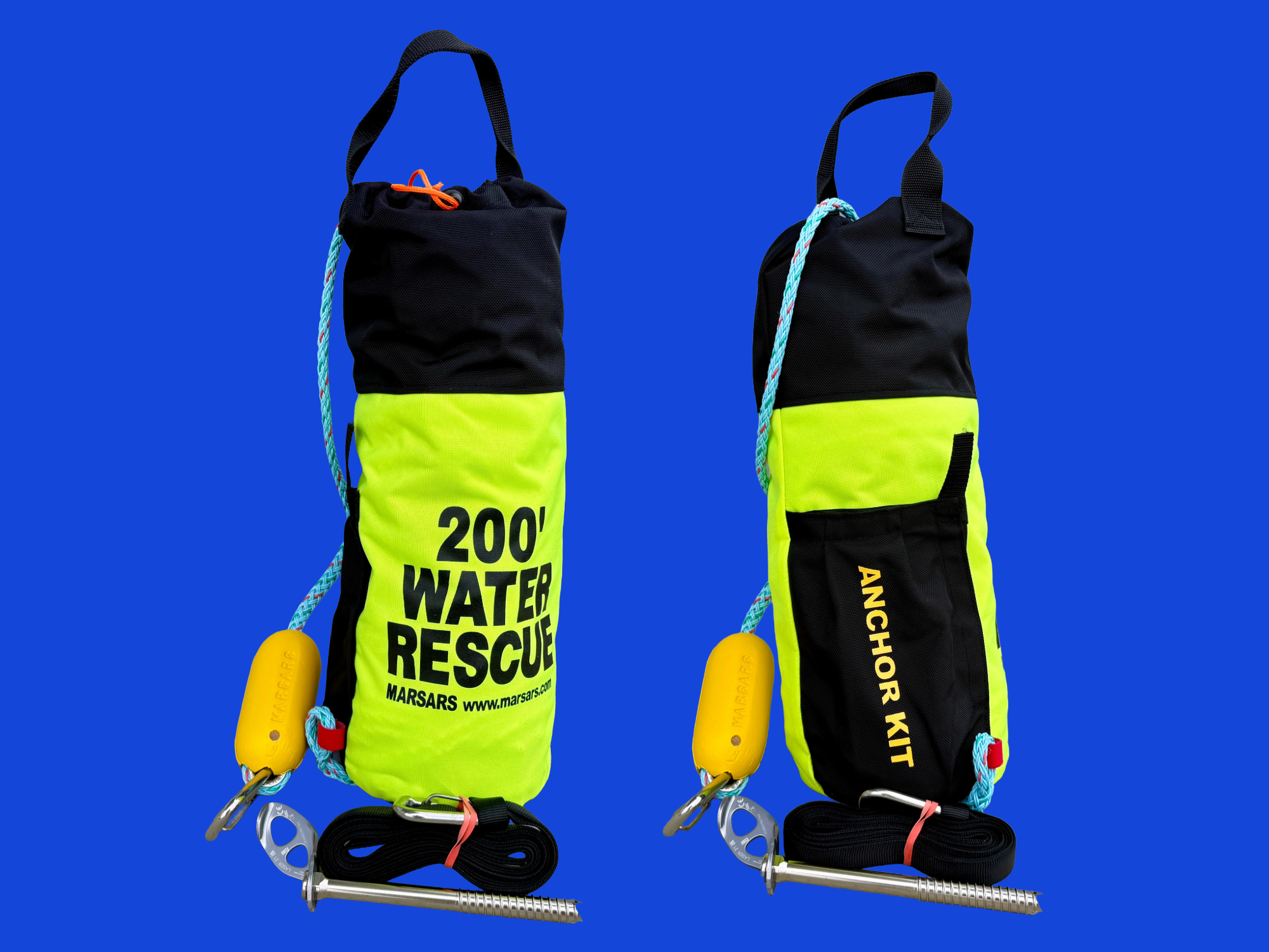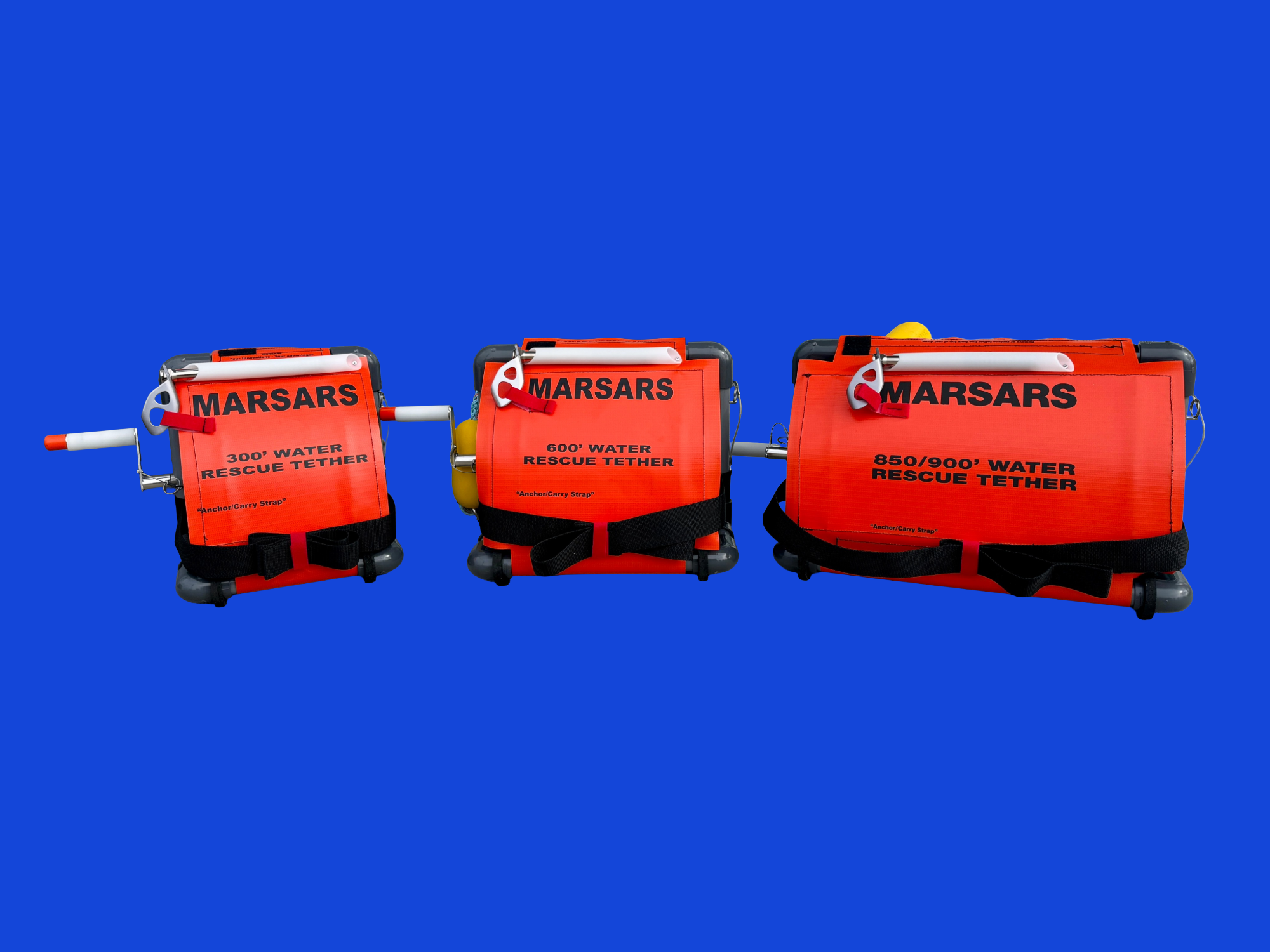All MARSARS' reels float with or without rope and non-locking carabineers are provided for assured escape from life threatening situations.