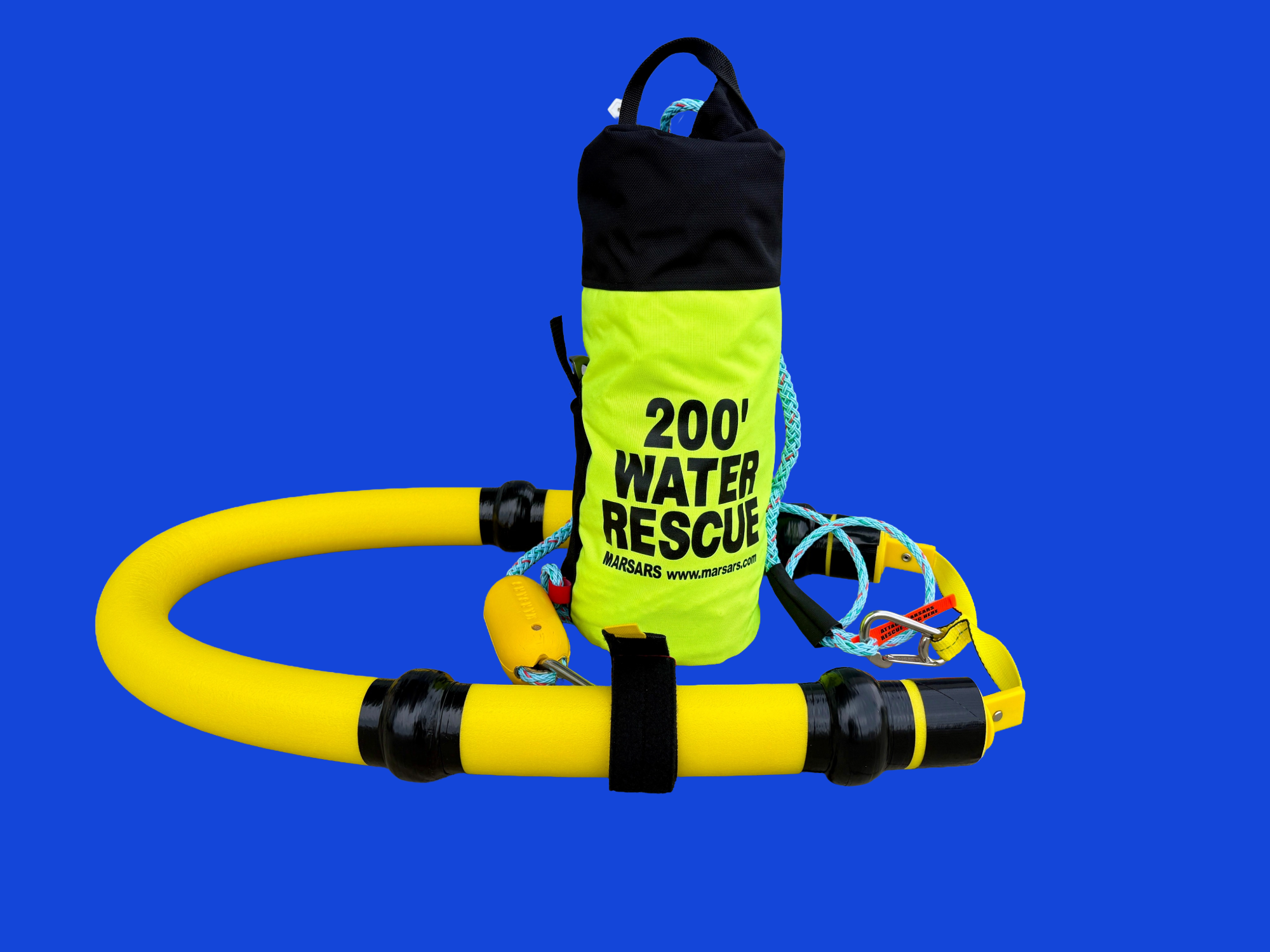 MARSARS' ice rescue tether bags and reels of 300' or less, feature a rescue sling hook-up point that is pre-rigged 6' from the tether's outboard terminal end. For assured escape, our tethers include a non-locking freeze-free carabiner. The buoyant float prevents disconnected terminal end from sinking.